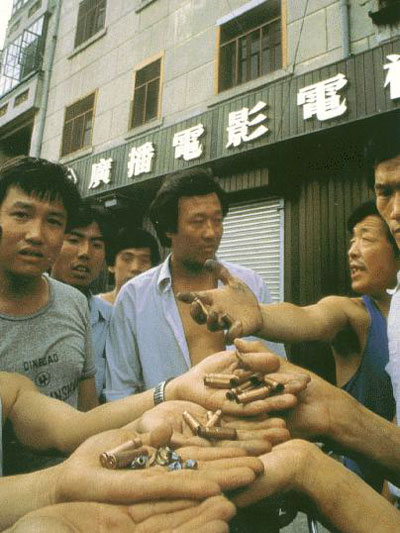 战火稍息,惊魂未定的北京市民向记者展示军队开枪后遗下的各种口径弹壳。 摄影:今枝弘一 -- Beijing citizens show bullets and shells to news reporters.