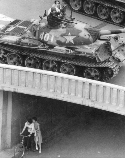 骑脚踏车上班者经过成群坦克和装甲车。 -- A wall of tanks and APCs greet bicycle commuters near TAM Square (6/13).